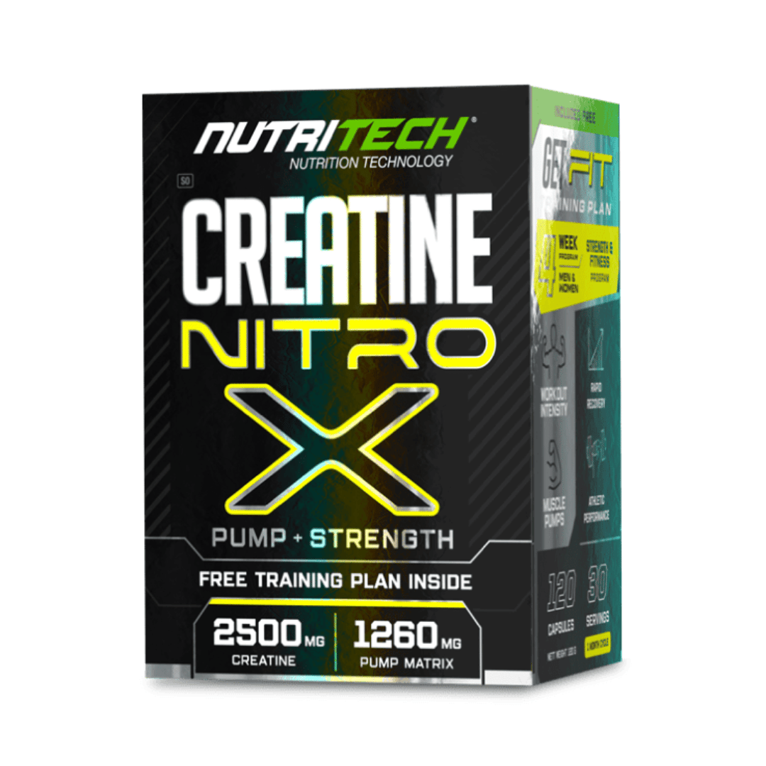 Nutritech Creatine Nitro X has been formulated as a concentrated nitric oxide precursor, in easy-to-take capsule form. A single serving of NITROX delivers 750mg of L-Citruline, 400mg of Beta-Alanine, and 2,500mg of Creatine to amplify muscle pumps, increase strength, enhance workout performance and endurance, buffer lactic acid and support faster recovery from your workout.