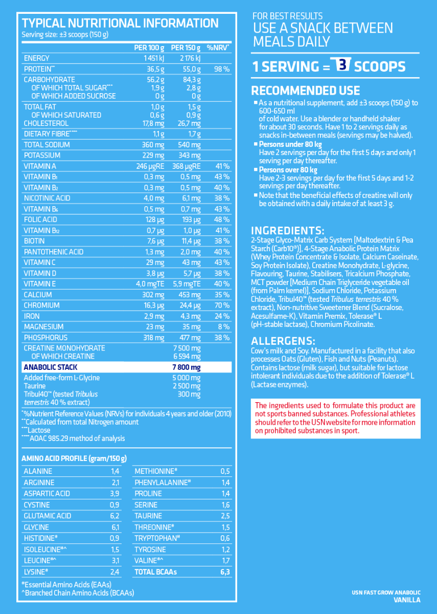 Fast Grow Anabolic is an advanced formulation, high protein supplement with an outstanding amino ratio to aid lean muscle building. The addition of Taurine and Tribulus Terrestris contributes to boosted power and strength. The 2-stage Glyco-Matrix Carb System is designed to boost muscle glycogen storage. The Cookie Dough flavour is not Halaal certified.